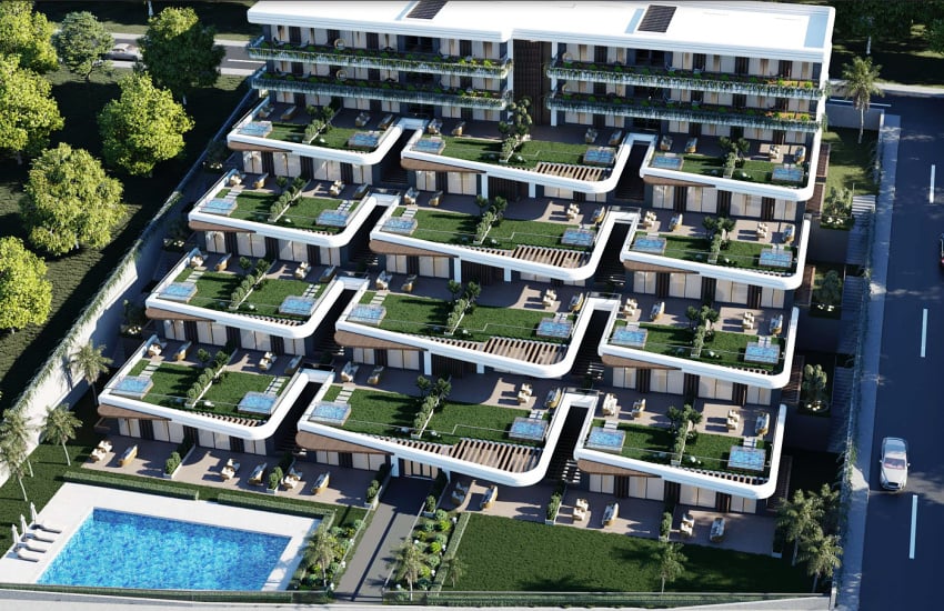 The project of flats with detached gardens is situated on 4.000 m² total plots. Here, there are indoor and outdoor parking, sports and activity grounds, a communal swimming pool, a generator, a water tank, 24/7 security service, and security cameras.