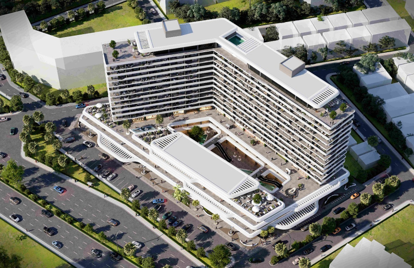 The project features a shopping venue, indoor parking lot, commercial units, and offices on the first three floors. From the fourth floor, there are luxury apartments. The communal amenities include a swimming pool, fitness center, terraces, recreational areas, and a lift.