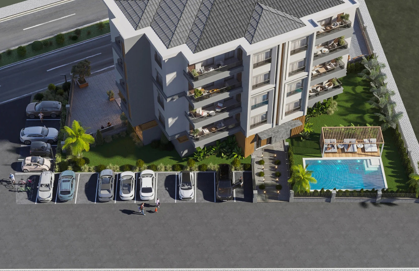 This five-storey complex is situated on 1,240 m² of land, offering a shared garden, open parking, and an outdoor pool for convenience.
