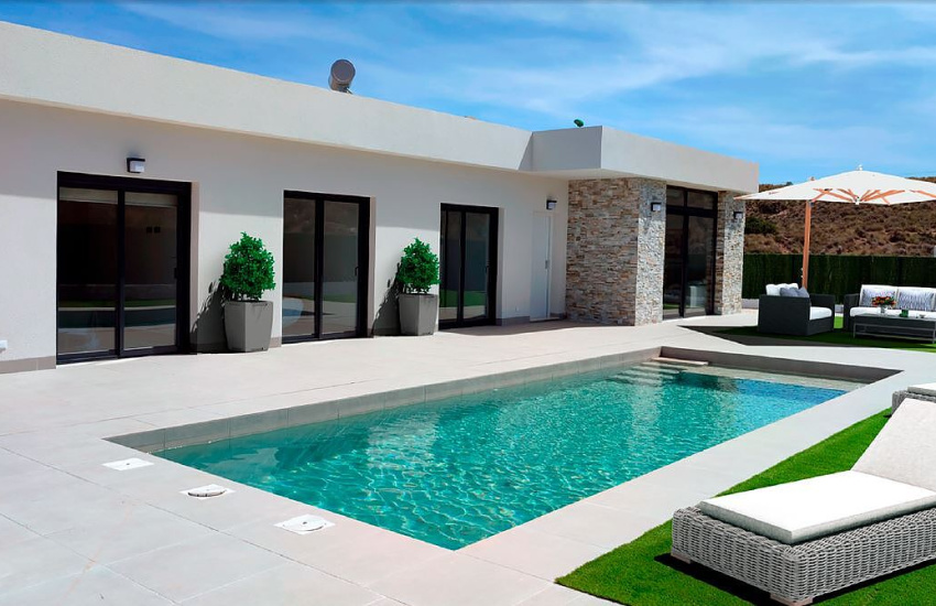 These properties for sale in Murcia, Spain showcase a pragmatic design infused with a Mediterranean flair. Spread across a single level, they feature generously proportioned outdoor spaces, including lush green areas, terraces, and a pool. Inside, you'll find convenient amenities like a laundry room and a guest toilet adjacent to the living room. The expansive living areas seamlessly connect with the open-plan kitchen. These Calasparra villas for sale encompass 3 bedrooms, each with fitted or walk-in wardrobes, with the master room exemplifying the latter.