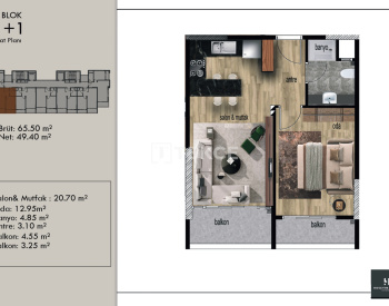 تتكون الشقق المكونة من غرفة نوم واحدة من غرفة معيشة، مطبخ مفتوح، حمام وشرفة. العقارات، التي تجذب الانتباه بالمواد عالية الجودة المستخدمة والتصنيع الماهر، مجهزة بمنتجات المجموعة العليا.