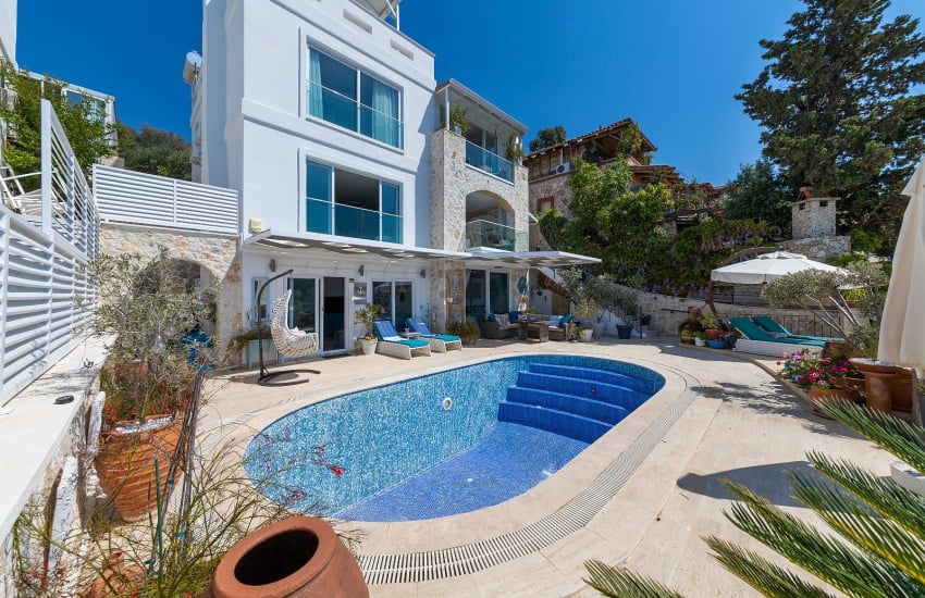 Die Villa zum Verkauf in Kalkan, Türkei, liegt nur 150 Meter vom Meer und dem Strand entfernt, 2 km vom Zentrum von Kalkan, 7 km vom Kaputaş-Strand, 17 km von der antiken Stadt Patara, 27 km vom Kaş Staatlichen Krankenhaus, das umfassende Gesundheitsdienstleistungen anbietet, und schließlich 120 km vom Flughafen Dalaman, dem nächstgelegenen Flughafen.