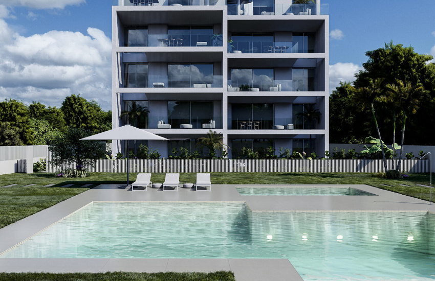 Apartamentos modernos de 2 y 3 dormitorios al sur con piscina y vistas a naranjos en Denia