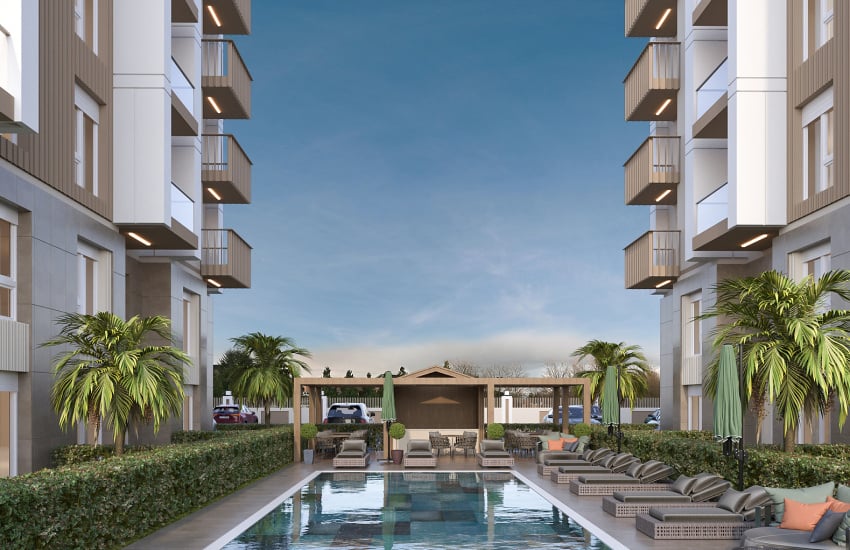 El proyecto está construido sobre un terreno de 2.746 m² y consta de 2 bloques con un total de 50 apartamentos. Cuenta con estacionamiento exterior, gimnasio, seguridad 24/7, sistema de cámaras de vigilancia, generador para áreas comunes, sistema satelital central, sistema de purificación de agua, gazebo, pool bar, área de juegos infantiles, piscina para niños y piscina.