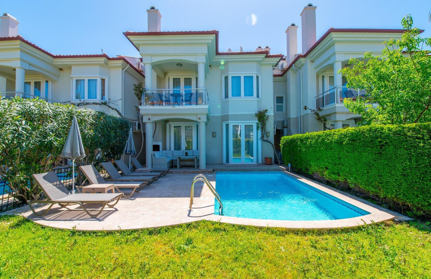 Esta casa en venta en Fethiye se encuentra en un complejo seguro que ofrece instalaciones sociales como mercado, restaurante y hammam. El complejo dispone de playa privada y estacionamiento al aire libre. Con su jardín privado y piscina, esta vivienda ofrece un espacio de vida completamente independiente. Además, la ubicación del complejo justo junto a la parada de minibús facilita el transporte.