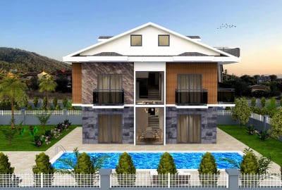 Las villas independientes en venta en el centro de Fethiye, Muğla tienen 450 m² de zona ajardinada y 210 m² de zona de uso interior con 4 dormitorios, todos con baño en suite.