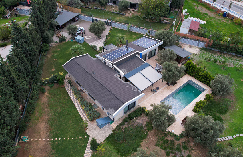 Villa, 4.925 m² arsa üzerinde yer almaktadır. Müstakil geniş bahçe içinde araç şarj istasyonunun bulunduğu 4 araçlık üstü kapalı otopark, 6 araçlık açık otopark, uzaktan kumanda ile yönetilebilen elektrikli bahçe giriş kapısı, 90 adet meyve ağacı, ithal botanik peyzaj, merkezi otomatik sulama sistemi, artezyen su kuyusu, evin tüm elektrik ihtiyacını karşılayan güneş enerjisi sistemi, çalışma atölyesi, tavuk kümesi ve yemleme alanları, çocuk oyun alanı ve ahşap oyun evi yer almaktadır. Villada ayrıca 50 m² yüzme havuzu ve 200 m² bahçe terası bulunmaktadır.